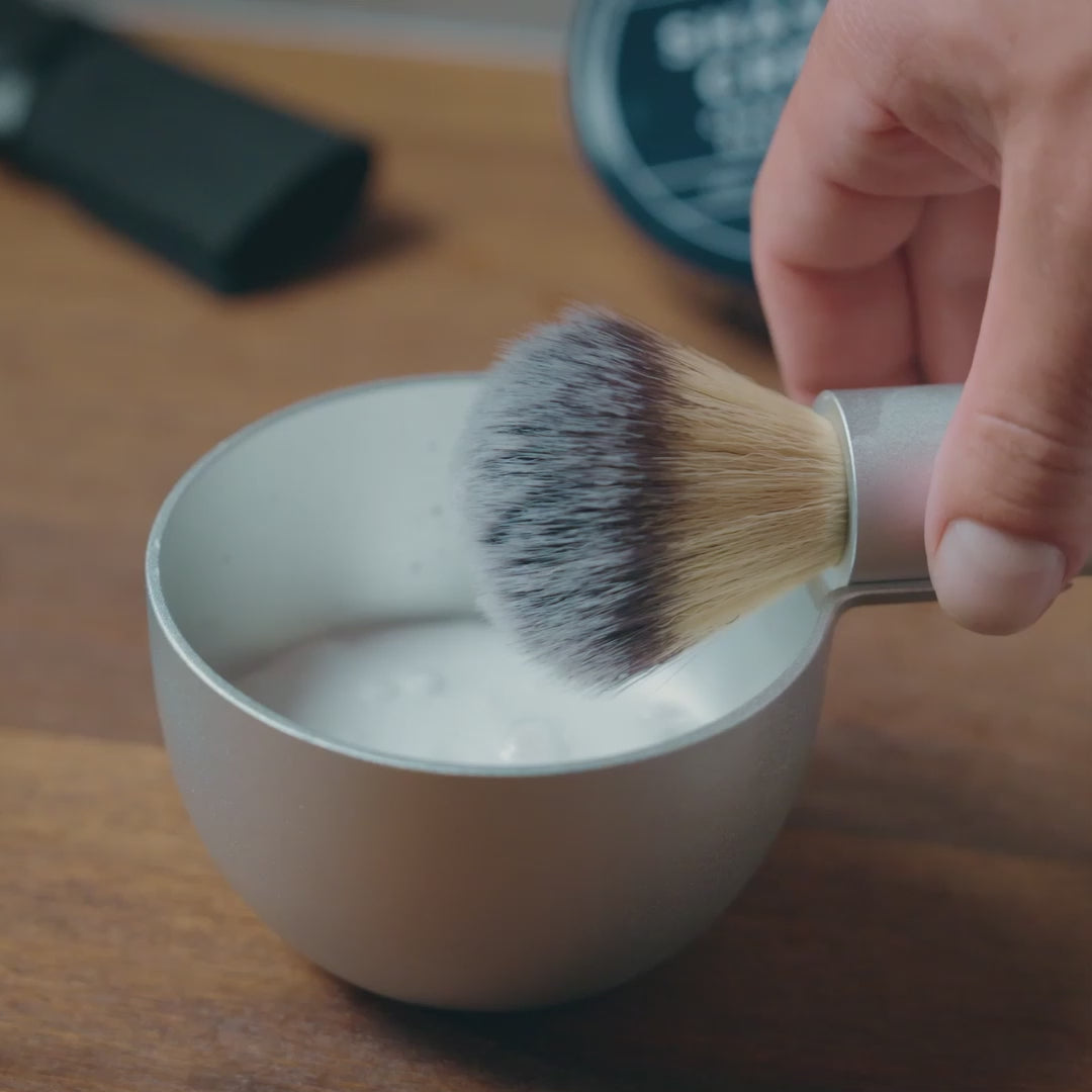 • Milled aluminum shaving brush with super-soft shaving bristles
